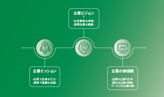 現在の状況に基づいて、私たちは革新の精神で、貿易に集中します。情報化とグローバル化をチャンスを捉え、世界市場で常に新しいビジネスモードを開発し、省資源で環境にやさしい統合サプライチェーンシステムを確立し、株主、スタッフ、顧客、サプライヤー、コミュニティ、州、社会、自然、その他の関係者と調和のとれた方法で統合します。私たちは、新しい国際貿易の方法で社会が資源を良い方法で利用することを促進し、社会とともに新しい「グリーンで環境にやさしい持続可能な」価値を創造し、未来の美しい庭園の確立に貢献します。